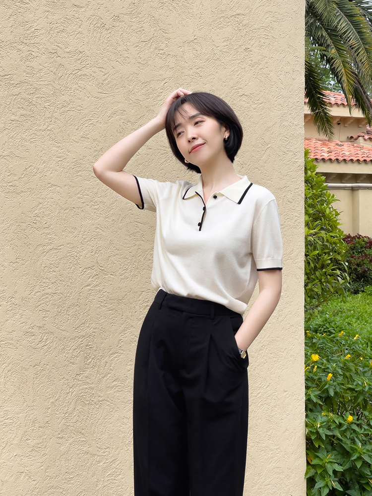 LOOK6:翻领短袖针织衫+直筒西裤。