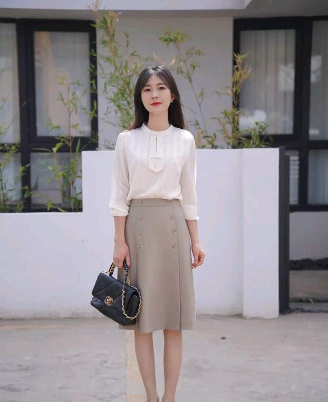 想要把白色衬衫穿出高级感,不仅要选最合适的款式,还要会搭配,这位时尚博主选择了浅灰色半身裙来搭配,在视觉上可以突出女性特有的温柔气质。