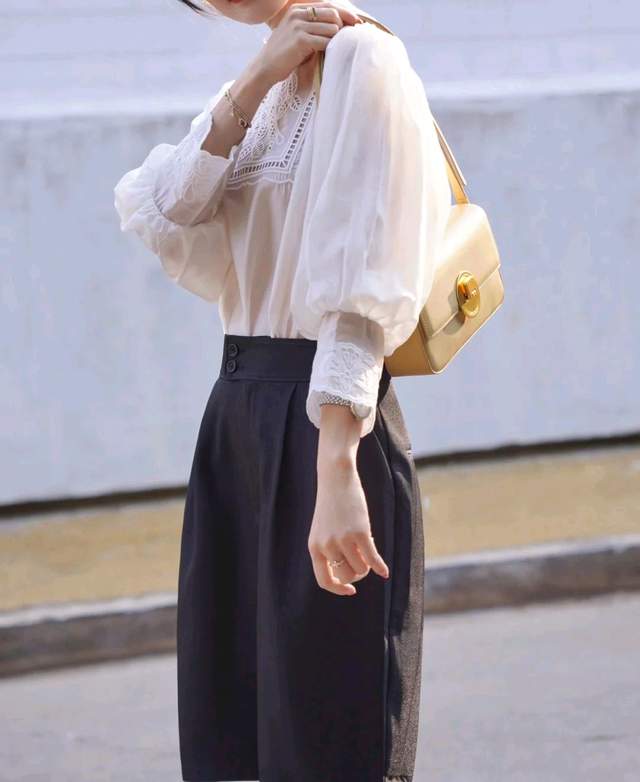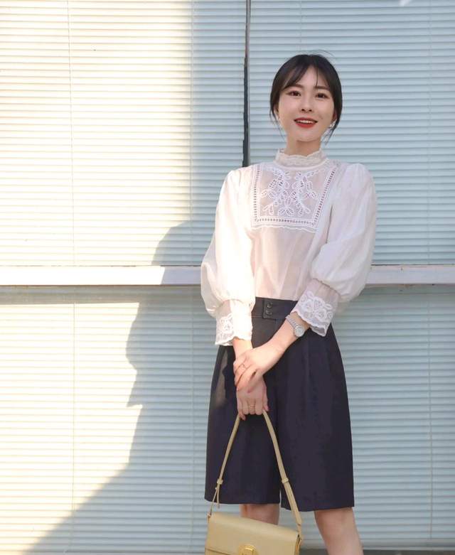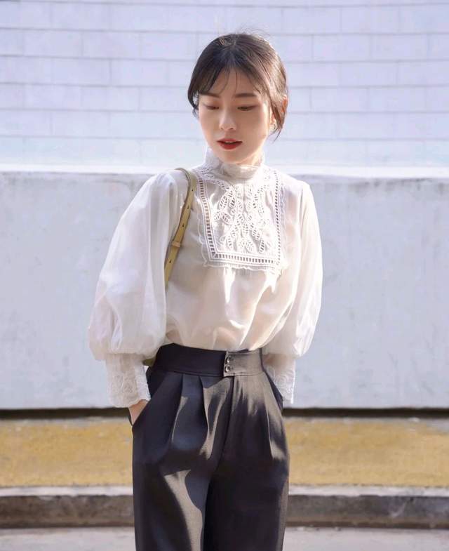 这位时尚博主所选择的衬衫很有特点,领口采用了花边设计,也就是我们常说的蕾丝花边,起到了点缀的作用。
