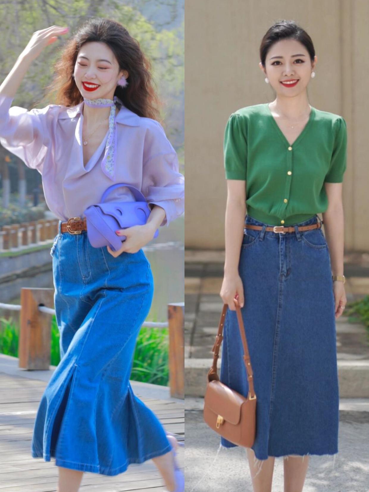 牛仔半身裙是比较独特的半身裙款式,因为它的质地略显硬挺,所以整体就非常有轮廓感,与质地柔软的衬衫结合后,还会营造出一种“软硬结合”的感觉,刚柔并济、英气十足,看起来还很休闲,有种法式浪漫风的氛围。