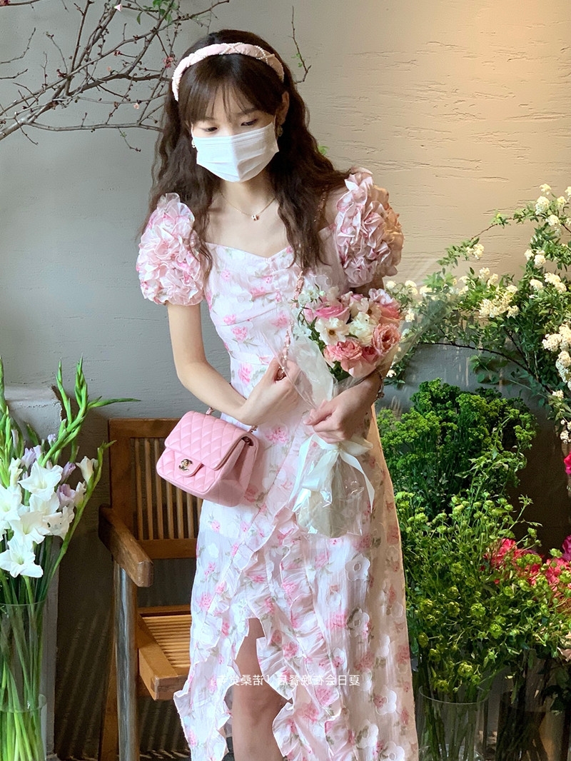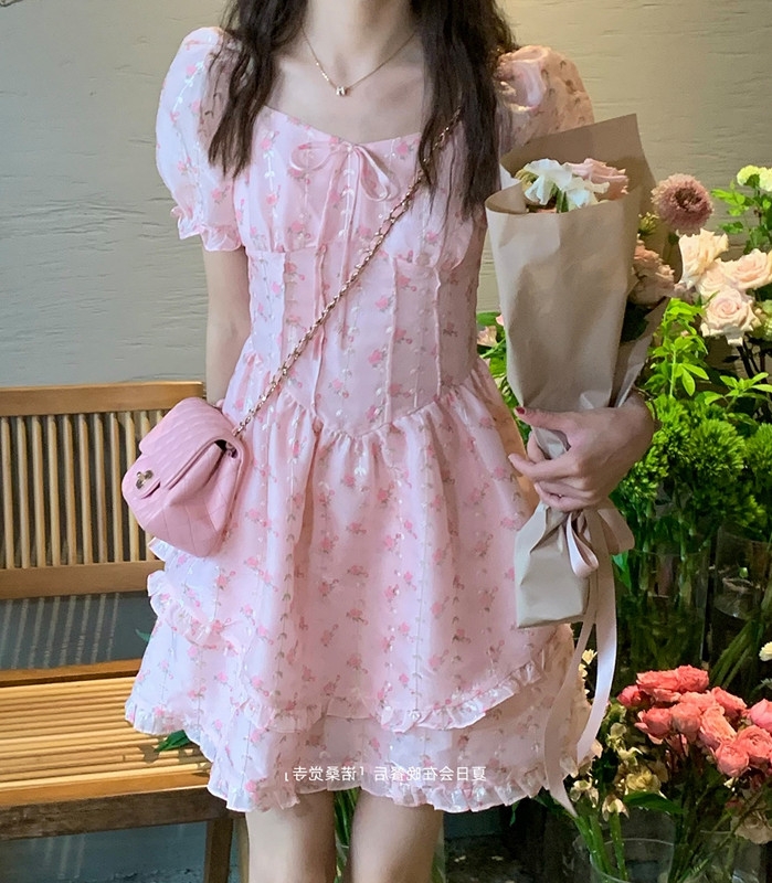 夏日少女甜美粉色碎花夏蛋糕裙显瘦蝴蝶结泡泡袖连衣裙会在晚餐后