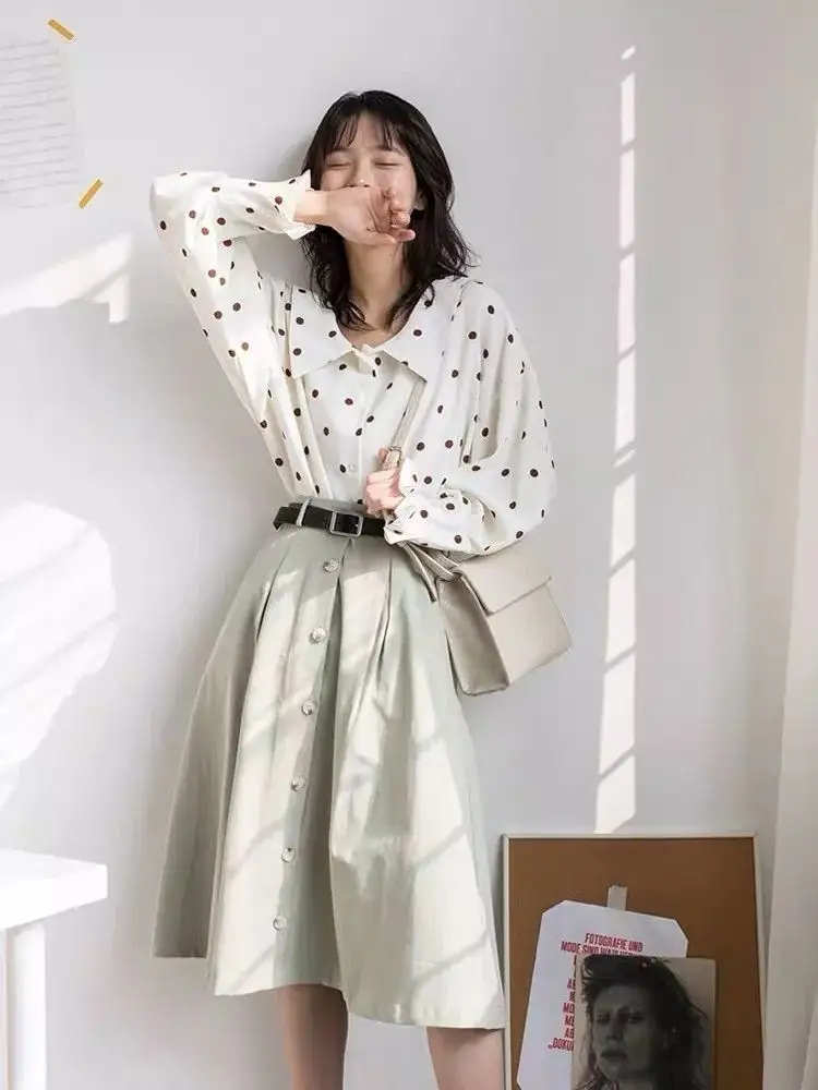 硬朗的衬衫会将整体的风格趋于中性风,如果想要更柔美有女人味,那么就试试衬衫搭配半身裙的穿法,白色的波点衬衫多了一份俏皮感,木耳边的袖口也能凸显女性魅力,下半身搭配一条A字裙,清凉舒适的同时也能遮肉显瘦,通过腰带来勾勒出腰线,小个子这样穿显高效果更出色。