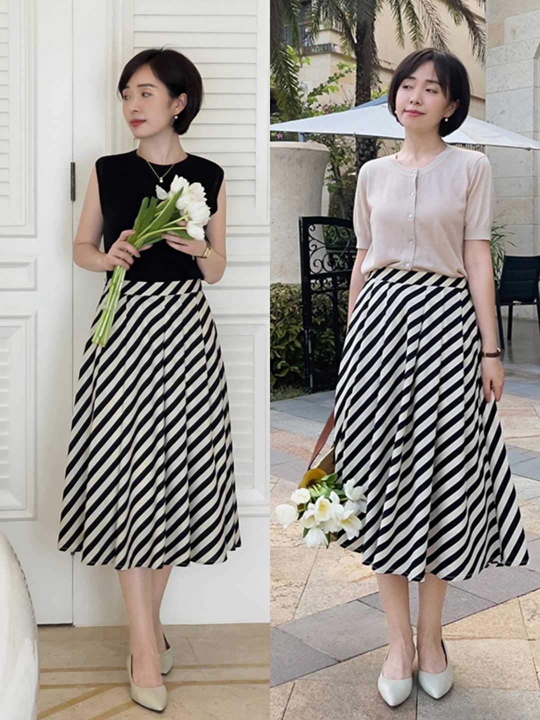 或者你还可以在春夏季节去尝试用各种修身的针织上衣配上高腰半身裙,虽然是夏天,但是针织衫依然不会被我们遗忘,轻薄的材质穿起来反而会很透气,非常的舒适,搭配上条纹裙装还能营造层次感。
