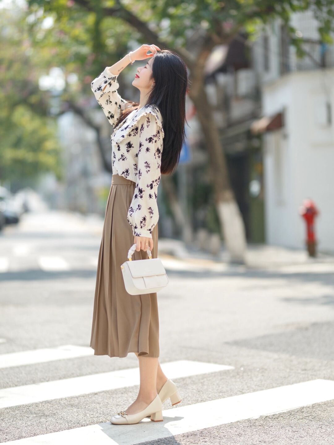 这样咖系配色果然自带复古高级感,也值得我们借鉴学习,把米杏色“印花衬衫”塞进半身裙里面,可以很高地提升腰线,达到显高显瘦的效果,同时用米色中跟鞋搭配小巧的白色包包,精致的法式穿搭造型就出来了,是不是很美。
