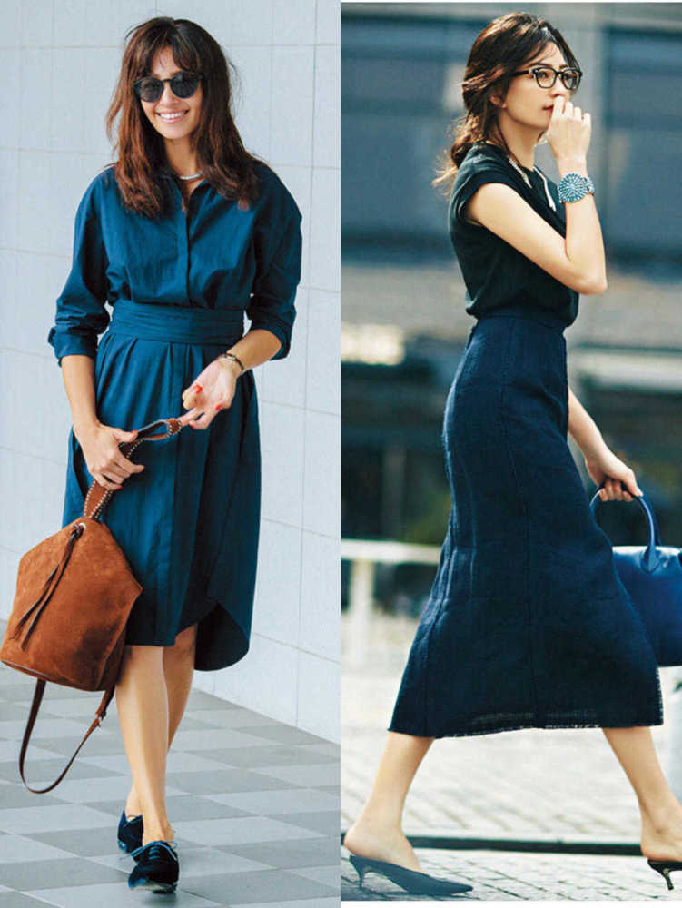 最简单的搭配方式,就是利用同色系搭配,让穿搭看起来足够耐看有品位,可以用蓝色的衬衫,搭配蓝色的半身裙,如果觉得这种配色很单调,可以搭配一款棕色的包包,整体配色显档次,能够让搭配看起来更有品质感。