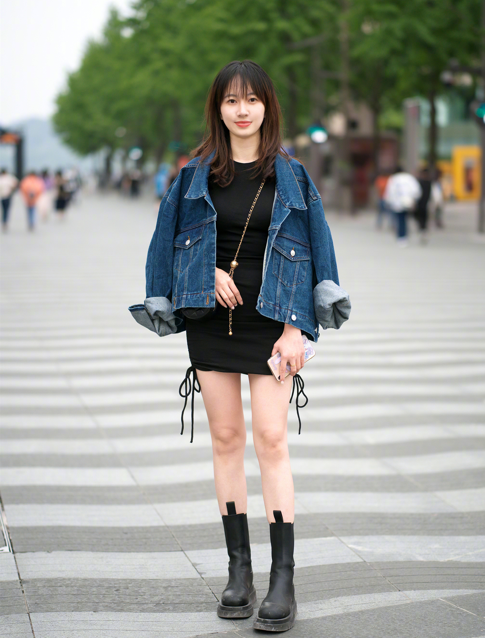 如果你的身形较为纤瘦的话,那就可以选择“膝上长度”的抽绳连衣裙搭配短款牛仔外套。不仅能塑造出优越的身材比例,还能延长你的腿部比例,穿出大长腿的效果。
