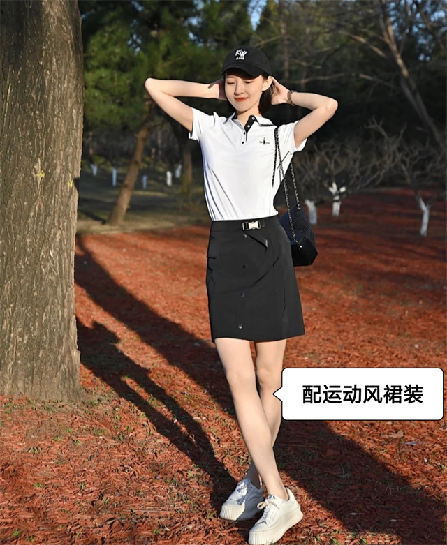 polo衫是妥妥的运动风单品,不适合搭配过于修身或性感的裙装,像上面这种带有运动元素的半身裙才是正确的打开方式。