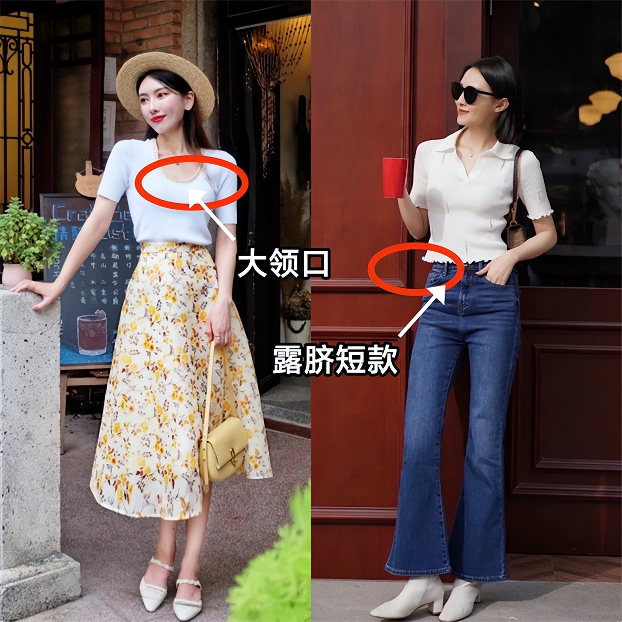 修身的针织T恤一定要选择大领口设计,长度在肚脐附近的短款最能提升身高。面料要选择柔软轻薄又透气的针织面料,这样就能拥有清凉一夏~