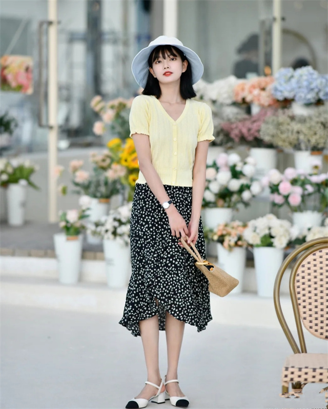 这件鹅黄色针织T恤勾勒出优美的上半身线条,搭配宽松轻盈的雪纺碎花中长裙,这才是小仙女,夏天的打开方式~