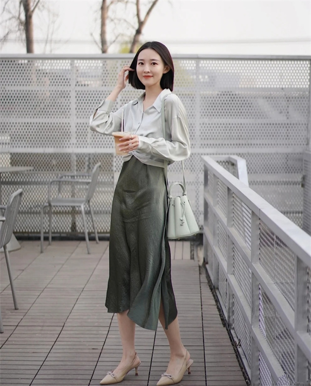 裙子可以多试着穿彩色系配基础色衬衫。想要优雅气质,那就用低饱和低亮度的彩色配衬衫;要活泼时髦,那就用低饱和中高亮度,或高饱和低亮度的彩色裙装搭配。