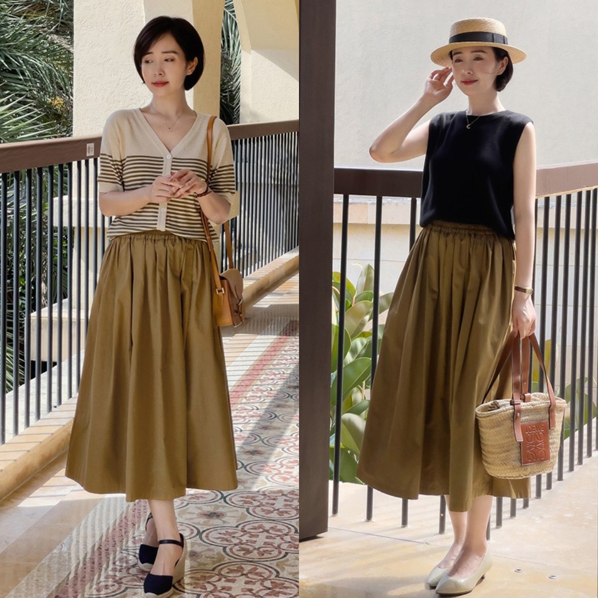 除此之外,在半身裙的颜色挑选上,我们也可以多加注意。如果你更想穿出成熟知性一些的风格,那就可以选择“大地色系”的半身裙,像是下图中的棕色或是卡其色等都是很不错的选择。与半身裙结合在一起,不仅能降低裙装过于柔美的感觉,还能让你的搭配看起来显得成熟稳重。