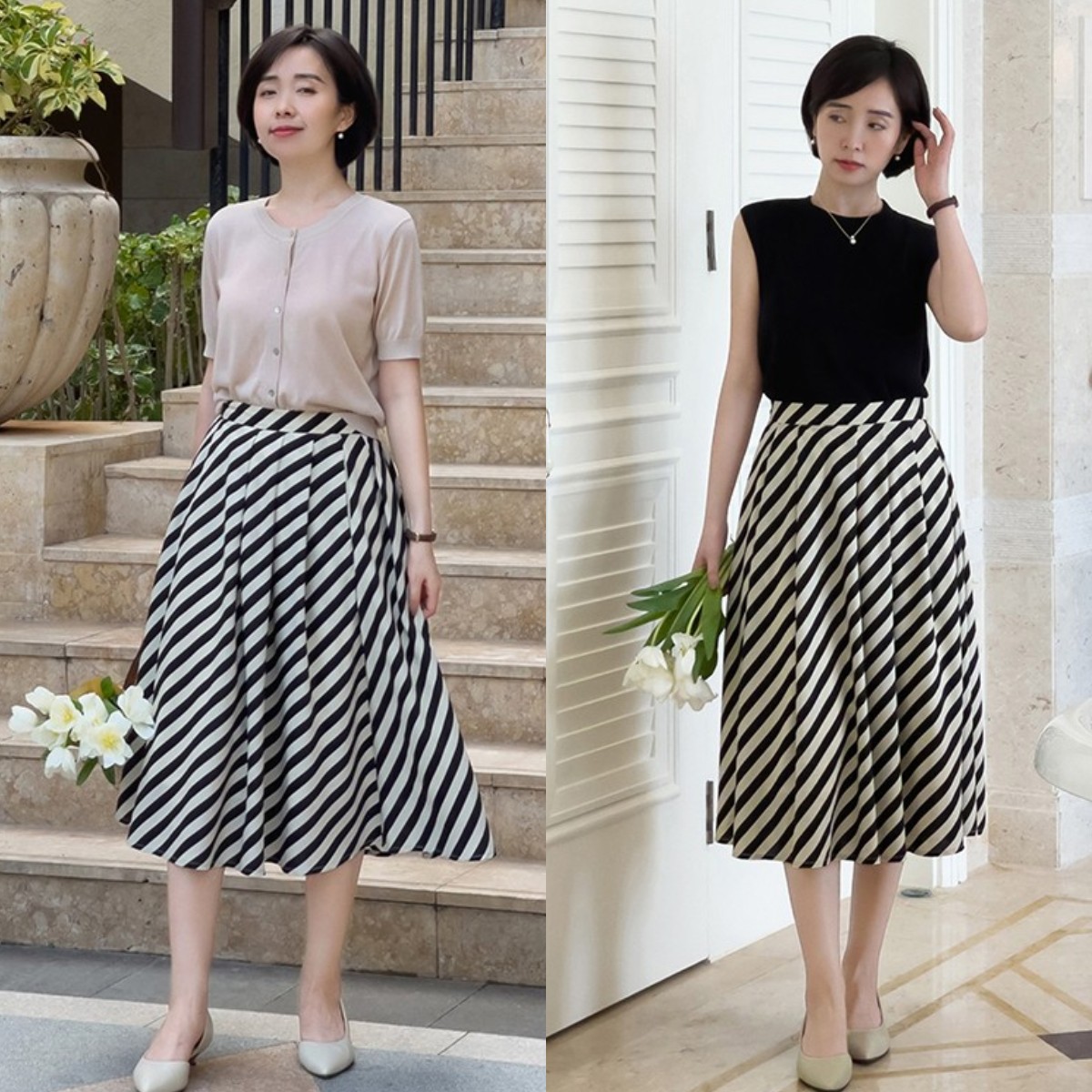 而对于上班族女人来说,带有“条纹元素”的半身裙才是最佳选择。条纹元素在时尚圈中经久不衰,复古又能增添干练正经的气息,与半身裙融合在一起,极大地削弱了其柔美感,但又不会让你的整体造型显得太过于严肃,会让你的气质加分不少。