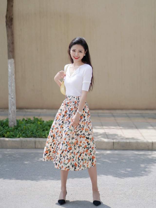 如果你是30岁左右的女性,可以选择这样白色的针织衫来和印花半身裙结合,轻松穿出高级的女人味。