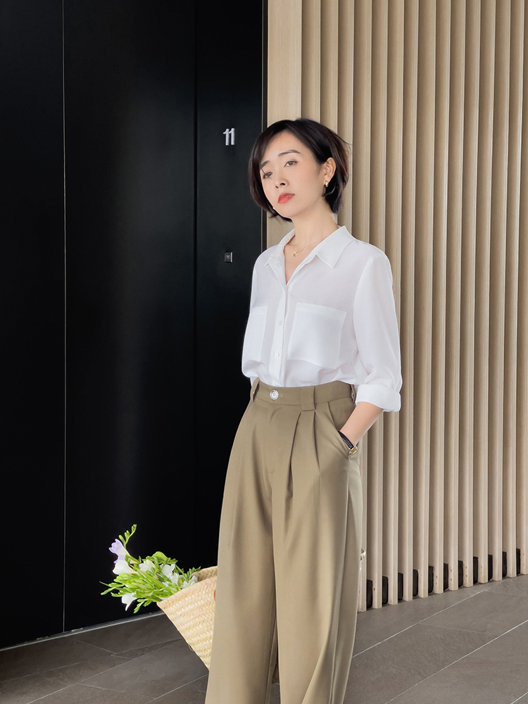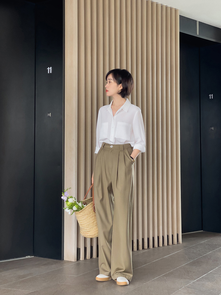 LOOK2:白色衬衫+卡其绿直筒西裤。