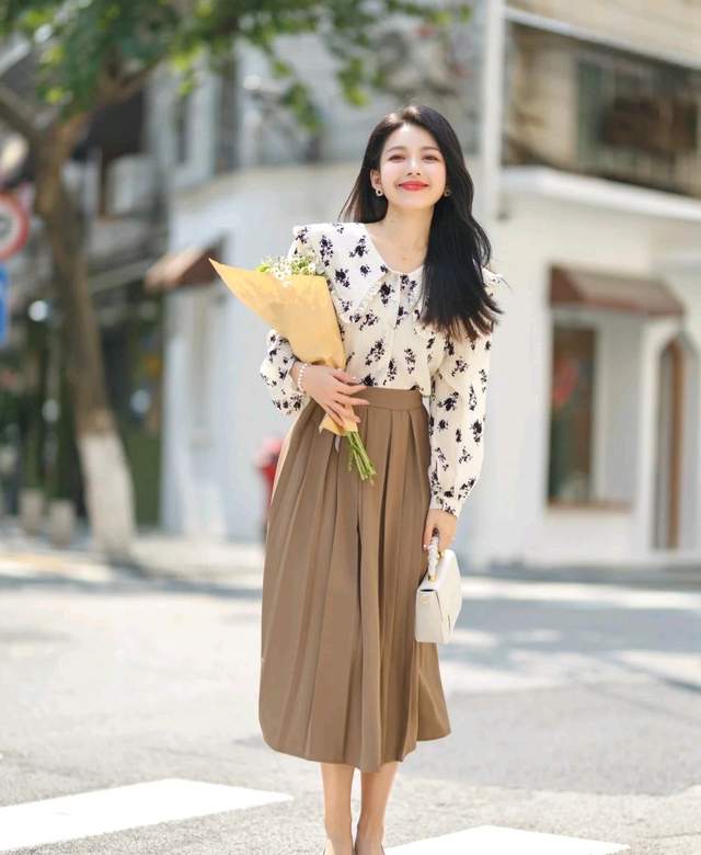 要注重腰线的问题,这位时尚博主把衬衫的下摆塞进了裙子里,轻松提高腰线,而且这条半身裙是上窄下宽的设计,可以轻松突出纤细的腰围,再加上包容性比较好,不挑身材。
