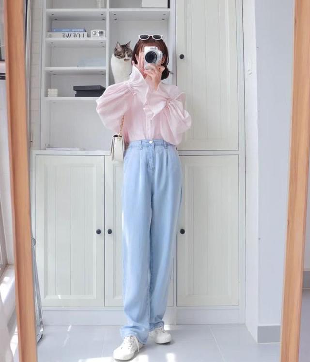 夏天粉色衬衫下面该穿什么颜色?粉色搭配牛仔蓝 不俗气又显高级(5)