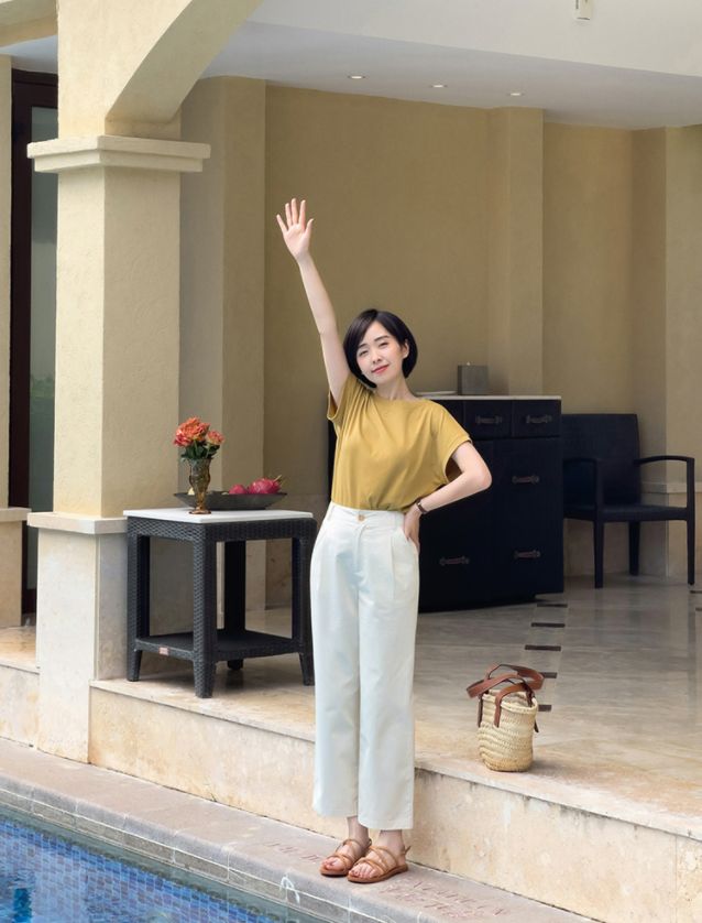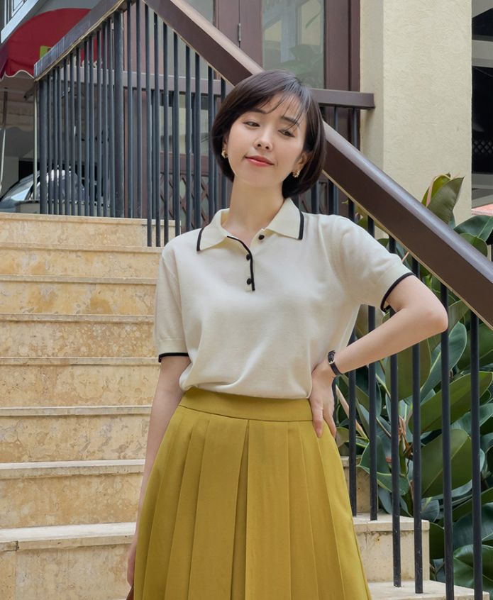 奶油色就是白色中加入暖黄的色调,整体呈现出暖色调的感觉。奶油色相比于纯白色要更温柔细腻,给人的感觉也更舒适。这种色彩出现在单品上属于不争不抢的一种色彩,温温柔柔但是很衬肤色,又不像纯白那么难驾驭。选择一件奶油色短袖针织衫,黄皮的中年女性穿着不仅优雅而且有很不错的减龄效果,可以大胆尝试~