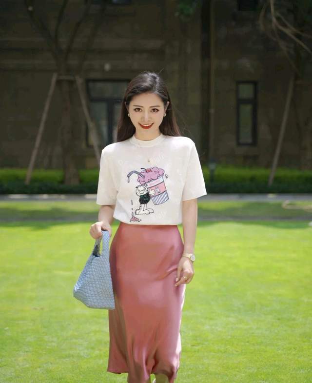 白色T恤略显宽松,对身材的要求不会很高,包容性比较强,但为了呈现出温柔的气质,这位时尚博主选择了粉色半身裙来搭配,突出了女性特有的温柔魅力。