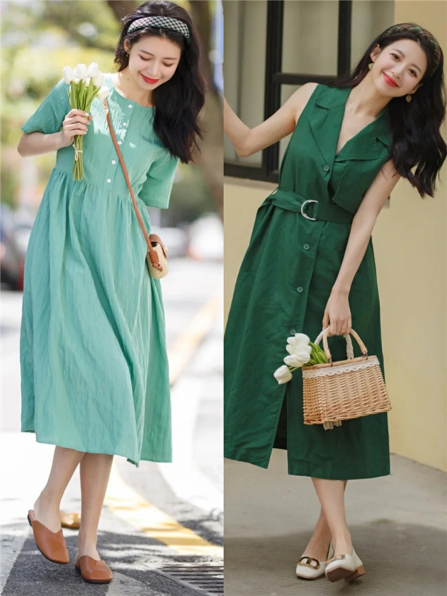 夏季搭配,你们可以尝试一些基础款的连衣裙,比如衬衫连衣裙也是很多潮人最爱的单品,衬衫的版型简洁干练,这种衬衫连衣裙的搭配也很适合夏季,能充分地修饰全身比例,最好离开领口的纽扣,这种搭配更能修饰颈部。