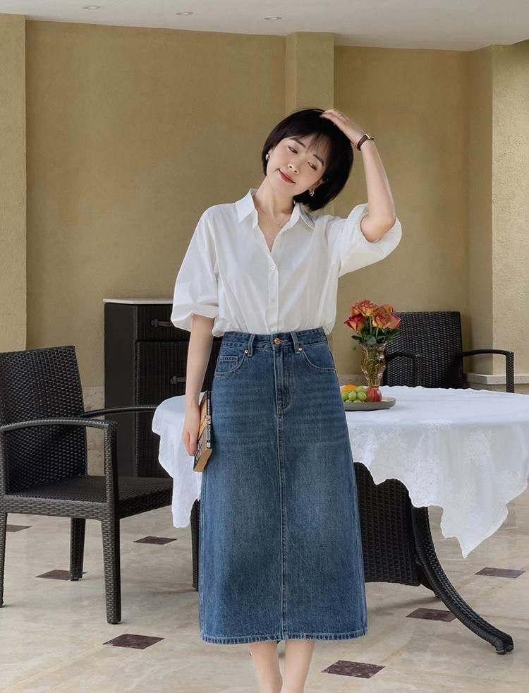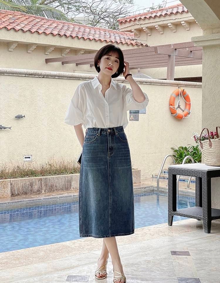 比较常用的牛仔裙和衬衫的搭配就很有张力。衬衫选择带条纹的款式,这种相比于纯色的衬衫看起来会更有趣,不会让人觉得单调,搭配上高腰水洗牛仔裙会很有港风的感觉。图中的直筒牛仔裙和蓝色条纹衬衫就给人清新大气的感觉。身材有些微胖的女性选择竖条纹还会有很不错的显瘦效果,对修饰身材也有很大的帮助。