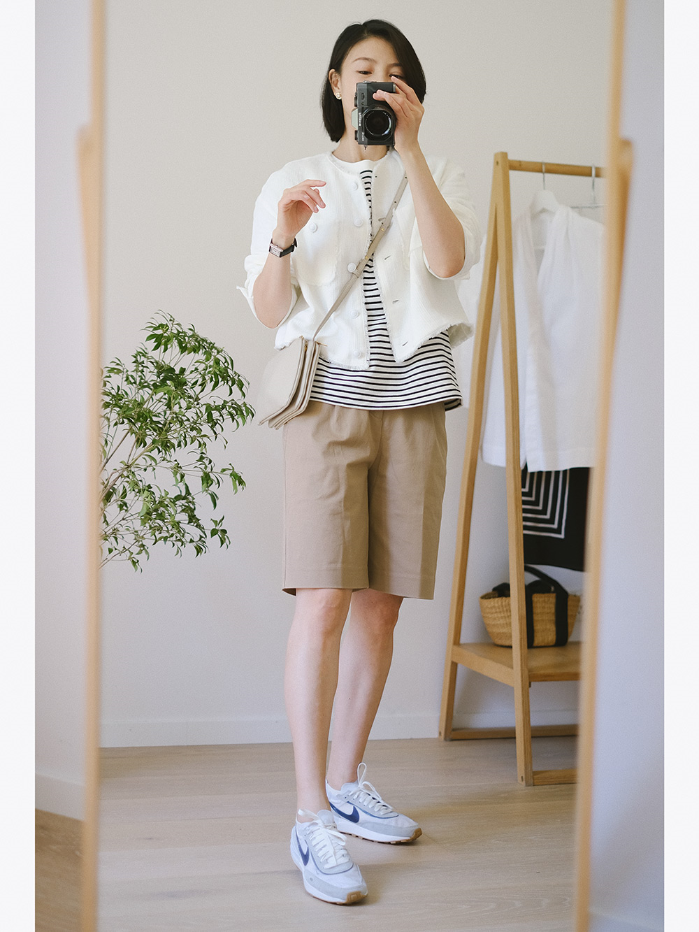 五分短裤的设计,大多数已经及膝或者而正好在膝盖以上的位置,可以完完全全的遮盖住粗壮的大腿,展露出纤细的小腿线条,配上运动鞋以及短外套这种百搭的单品,活泼又减龄。