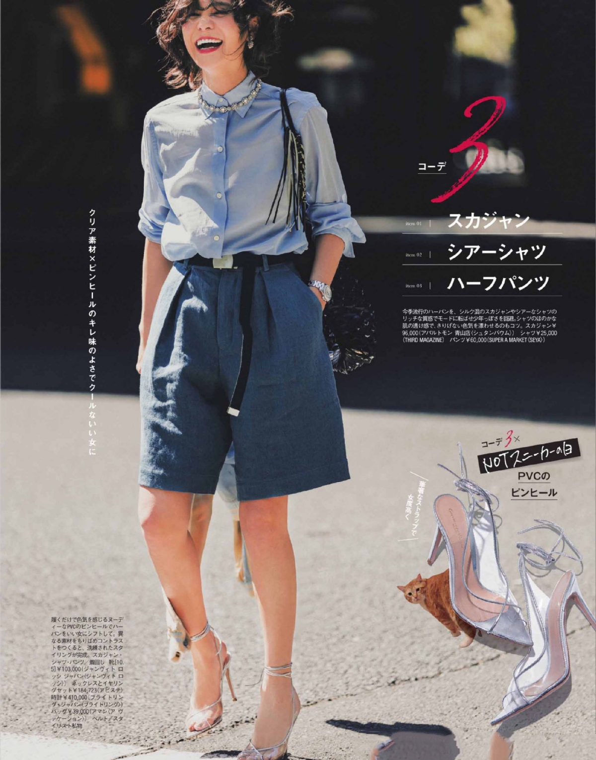 五分短裤由于把整个腿部线条一分为二,穿上身总给人一种随性大气之感,所以是特别用来适合搭配衬衫这种单品的,可以打造出个性又飒爽的大女人风格搭配,配上银色绑带高跟凉鞋以及黑色皮带,形成气场感满满的御姐造型。