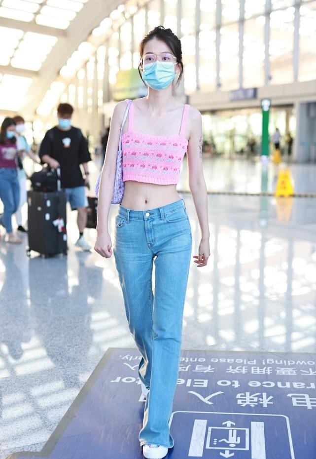 粉色针织吊带露脐背心+浅蓝色牛仔裤