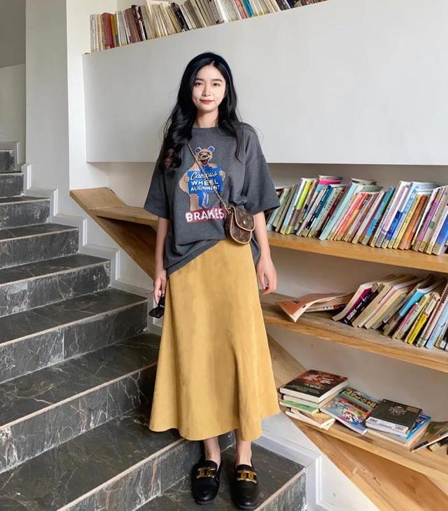 裙子的长度还是建议选择到遮过小腿位置的,这个长度穿起来挺显得体大方的,还带着几分优雅感。上衣简单配上一件灰色短袖t恤,也太好看了吧?