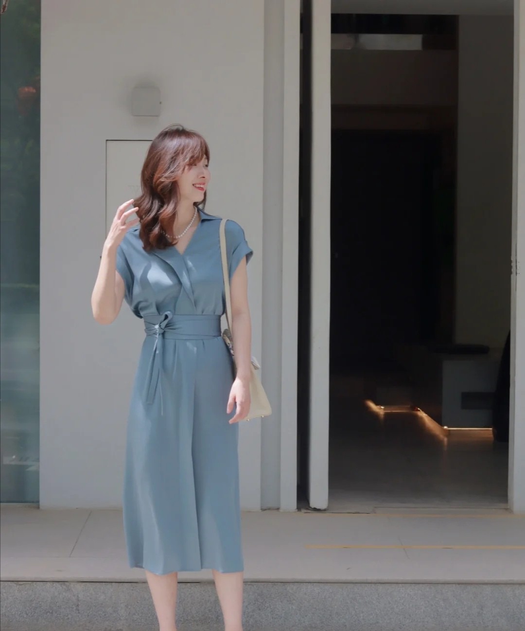 这条蓝色的连衣裙就是充满了高级魅力的单品,色彩的选用很到位,既不会带来浮夸的、艳丽的配色,也不会让整个的视觉被不美观的色彩扰乱。除此之外,这条裙子还自带腰带,可以将腰部轮廓以一个更加清晰的方案呈现出来。
