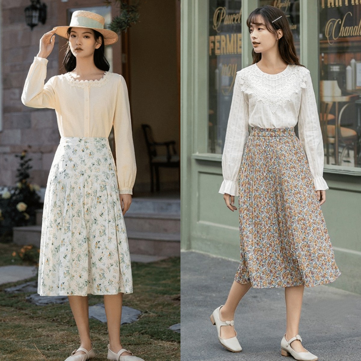 也可以选择下图中这种压褶处理比较小的裙子,它又称为“轻百褶裙”,比常规的百褶裙要更加柔软,垂坠性也更好。走起路来裙摆随风摆动,轻盈又灵动,飘逸感十足。