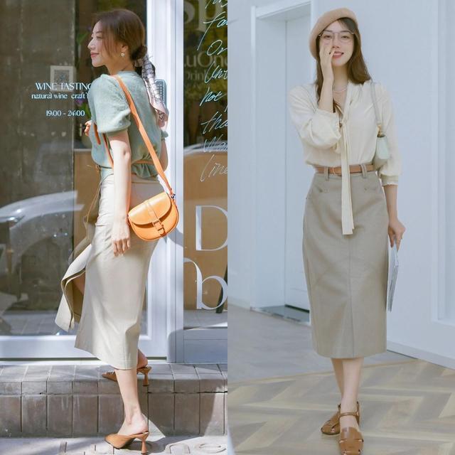 如图这一套极简耐看的风格,米色飘带衬衫,袖口的收口设计可以很好的修饰手臂短板,卡其色直筒半裙则可以最大限度的包容女性身材轮廓,随意戴上一顶百搭色的贝雷帽和温柔的长发,整体显得优雅又不失俏皮感,少女感十足。