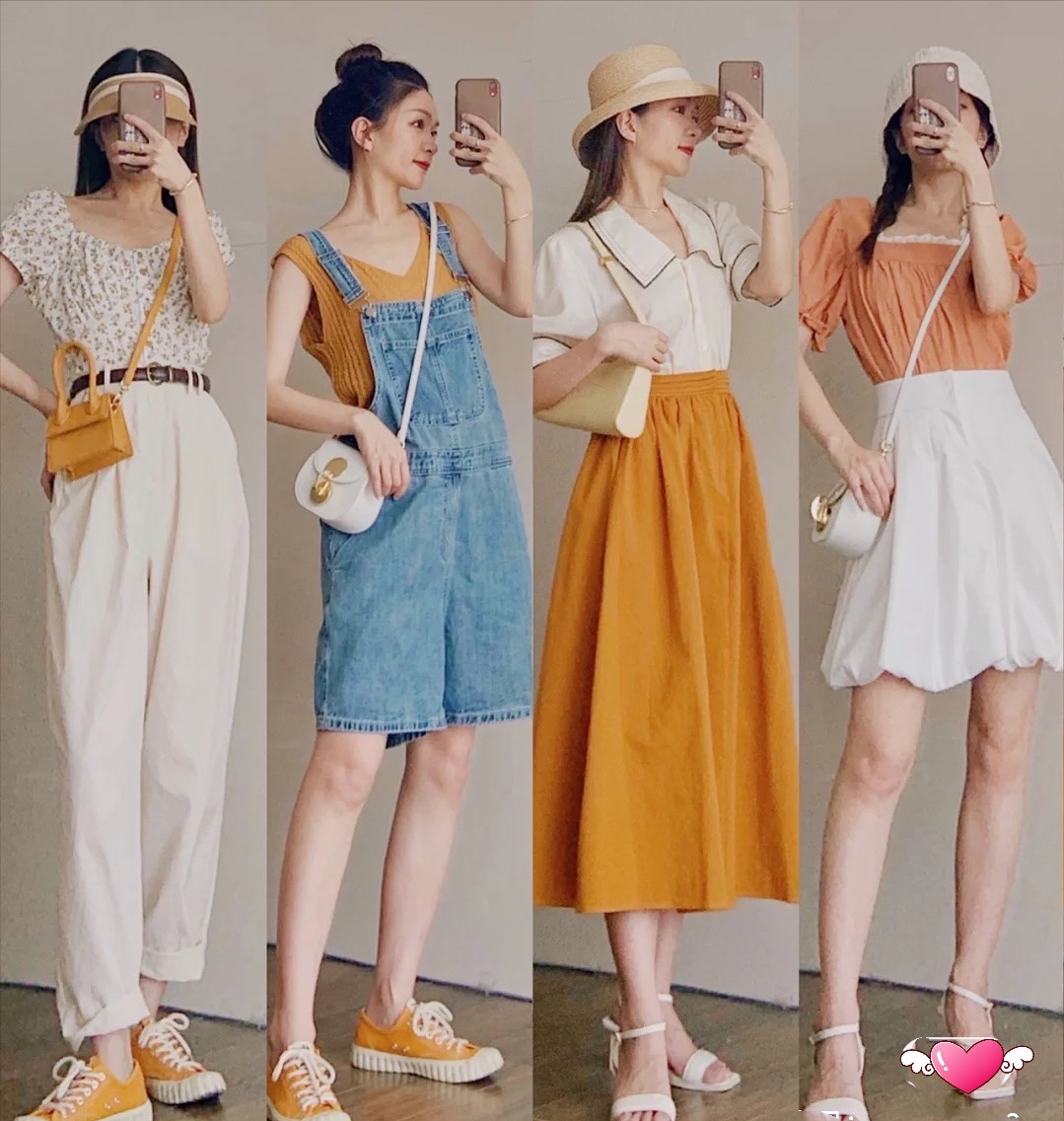 橙黄色的吊带背心搭配背带裤,很适合20出头的小女生,青春洋溢富有朝气。或者是大裙摆的高腰A字裙,因为鲜亮的橙黄色变得优雅又俏皮,它的实用性更强,因为在下半身对皮肤的影响不大,不同年轻和肤色的女士都能驾驭,搭配不同上衣可休闲通勤。