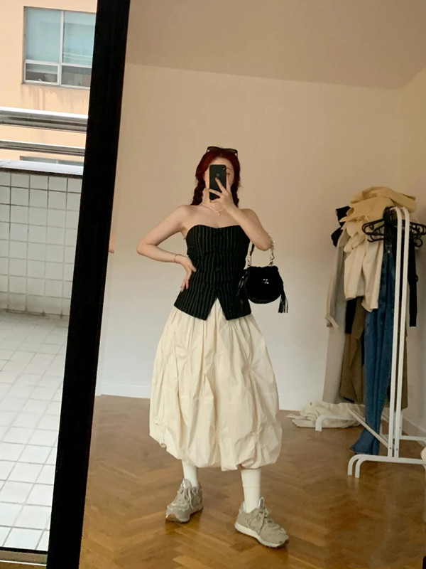 可以选择修身上衣、选择短款上衣、将衣角掖进裤腰等多种方式,都能轻而易举收缩腰身,使得两侧的线条呈现出向内收缩的趋势,进而将花苞裙多余的蓬感削弱,彰显出遮肉显瘦但不臃肿的效果。