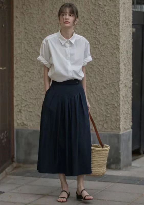 大多数半裙的裙摆设计都比较宽松飘逸,此时选择一双设计简约又鞋型小巧的凉鞋搭配起来秀气又时髦,很好地展现出了淑女感,这套蓝色衬衫配上驼色斜条纹高开衩半裙的造型,简约又显温柔,脚上的绑带人字拖平底凉鞋,为造型带来了休闲与清爽感。