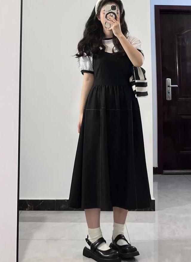 上衣直接配一件纯色简单的短袖t恤即可,很减龄又好看,不喜欢叠穿的话,直接单穿也是没有问题的。