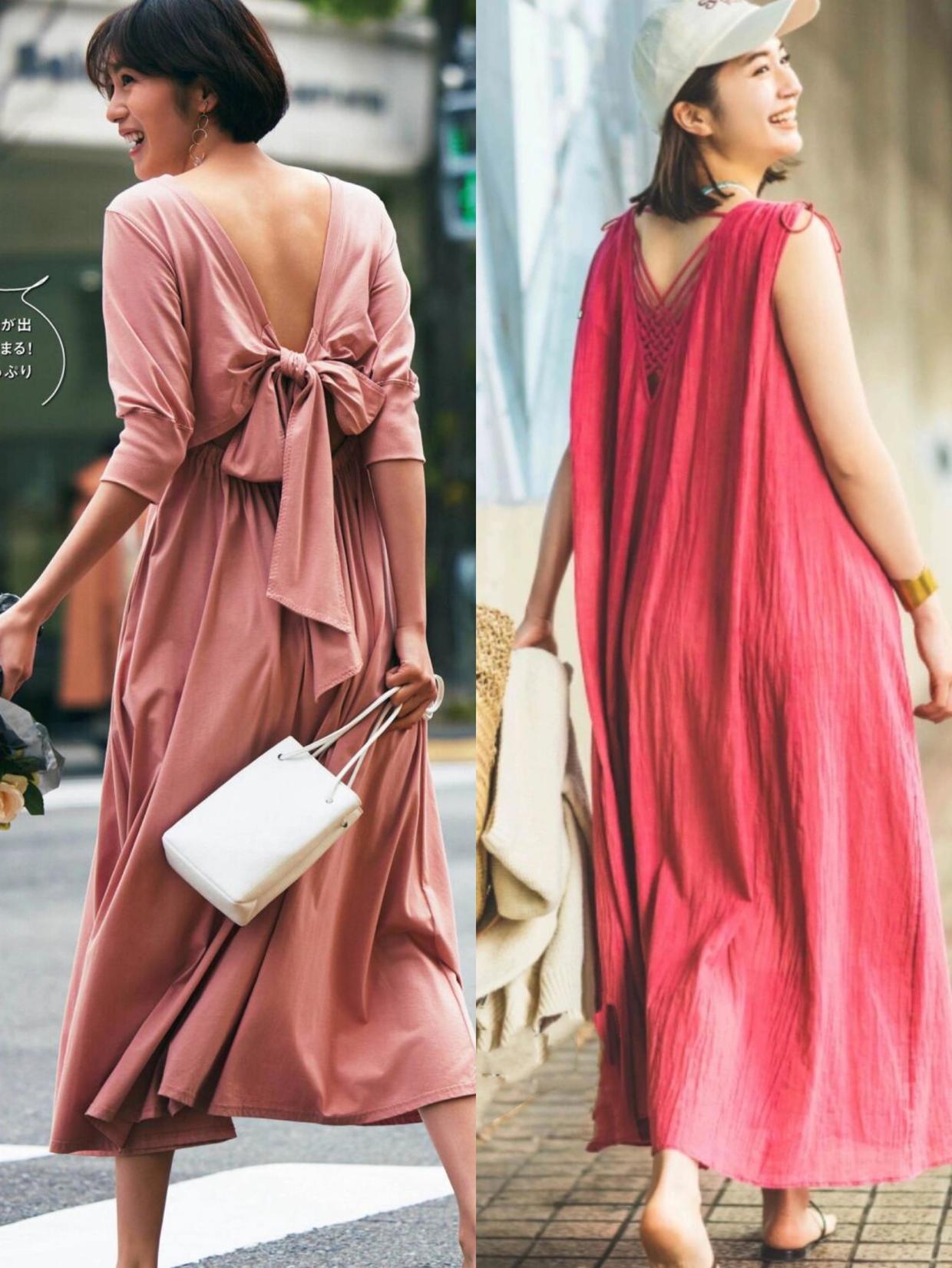 红色是最醒目的颜色之一,不是太好驾驭,比较考验穿搭者的气质,所以更建议气质出众的姐妹尝试。红色分为很多不同的饱和度,像玫红、豆沙红、西瓜红都属于它的范畴之中,这几款颜色都会比正红色更容易驾驭一些,大家可以试试日本时髦精身上这两款裙装,都在背部融入了V形镂空的设计,时尚感满满。