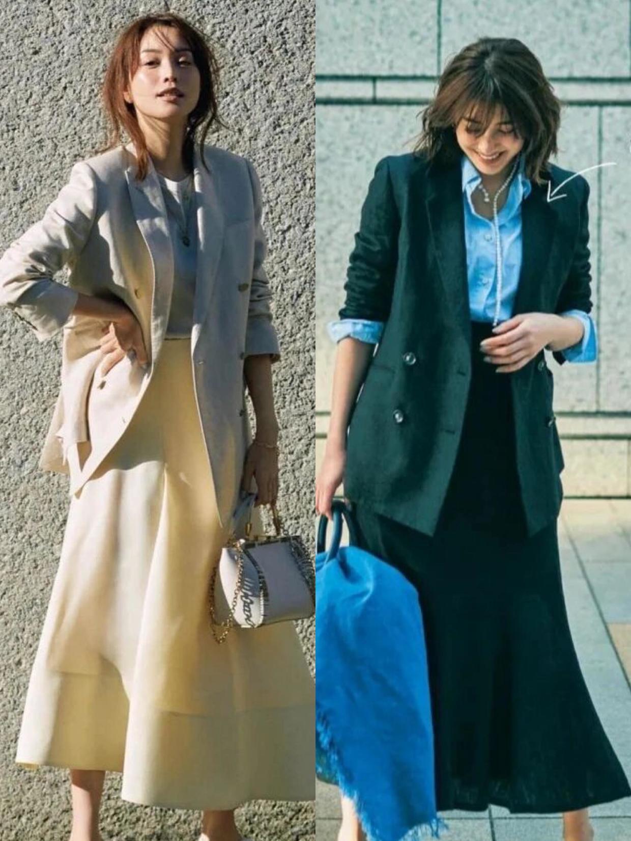 西装+半身裙是办公室职场lady最爱的搭配组合之一,西装正统知性,优雅大气,裙装温柔典雅,二者风格相反,却能形成不错的调和,弱化硬朗的商务感,强化温婉的女人味,只需要结合“敞怀穿法”就能露出里面的腰线,看起来丝毫不显拖沓。