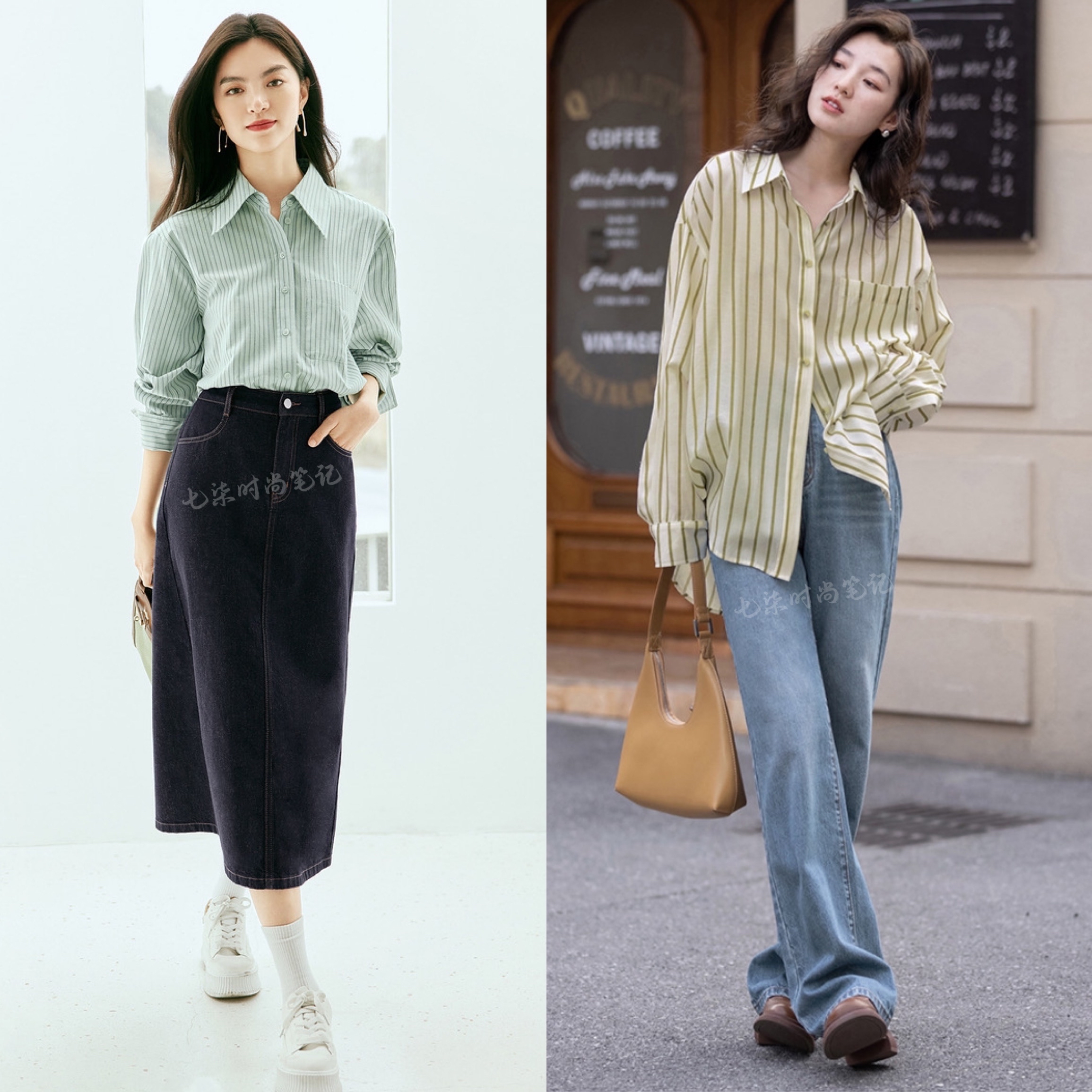 如果觉得纯色衬衫有点单调,想给普通的基础款加一点细节,条纹衬衫绝对值得考虑。条纹交织,远看简洁,近看又有藏不住的小细节,打破了衬衫的严谨正式,多了几分休闲感,无论搭配裙装还是裤装,都很好看。