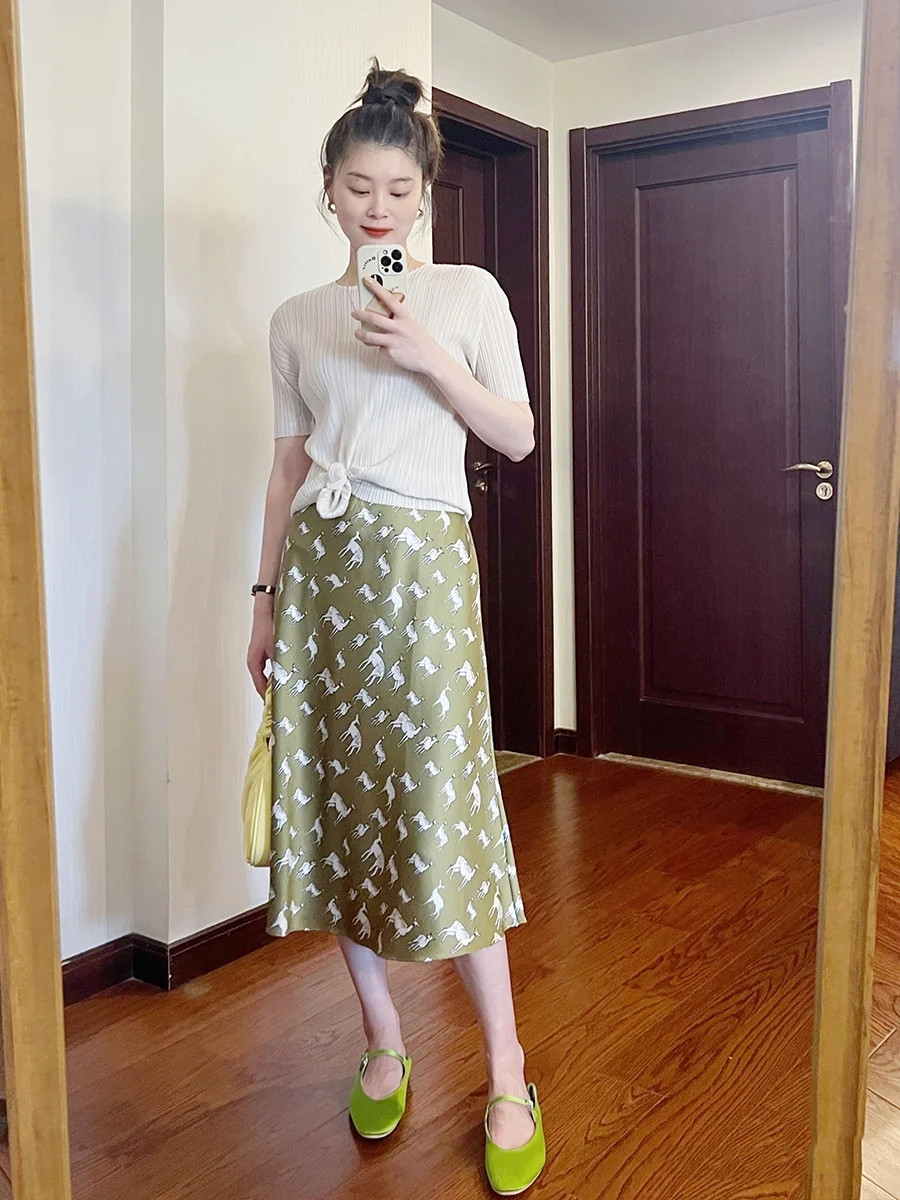 同样一身打扮如果我们通过一些细微的地方做出改变,达到整体氛围起到变化的效果,也会带来不一样的视觉体验。就像这件碎花半身裙,过膝的长度配上复古的棕色乐福鞋,还有一袭黑长直秀发的加持,整体呈现出来的是端庄优雅的轻熟范,显得是那么知性温婉。