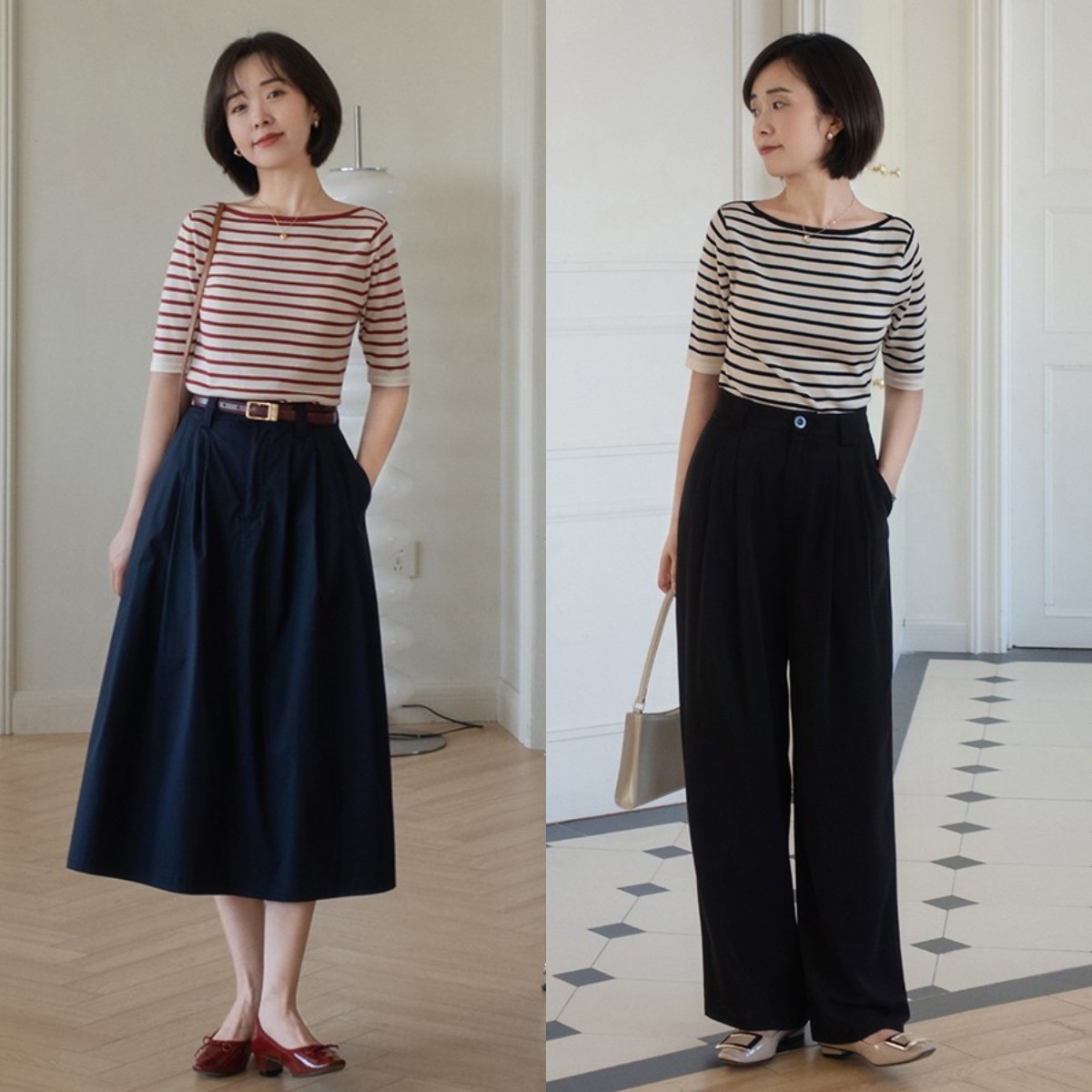 其实并不是说T恤一定不能穿,而是宽松款的T恤要想穿出气质感需要更多的技巧。想要更快掌握氛围感美女的秘诀,下图中的这种条纹短袖则是更简单的选择。