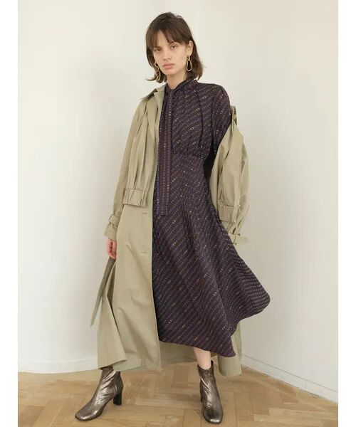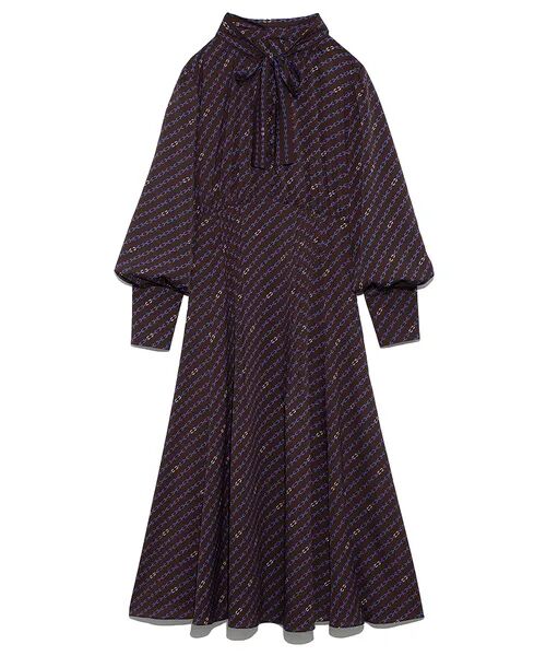▲棕色印花图案有一种复古的气息,领口处的蝴蝶结设计,窄袖设计,能给人一种优雅的感觉。腰部收缩拉高,产生腿长效果。
