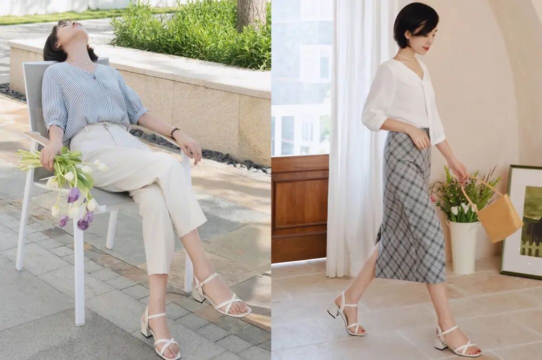 夏季是穿凉鞋的季节,而最能体现优雅女性气质的细带凉鞋,在通勤穿搭上要多用。当鞋子的颜色与衣服的颜色相呼应时,整体会更加和谐。例如,白色细带凉鞋搭配白色裤子和蓝色细条纹衬衫,呈现出清新干净的色调,或者巧妙的白色丝带衬衫搭配白色细带凉鞋,格子直裙,复杂而简单的结合,是一种清新而智慧的通勤气质。