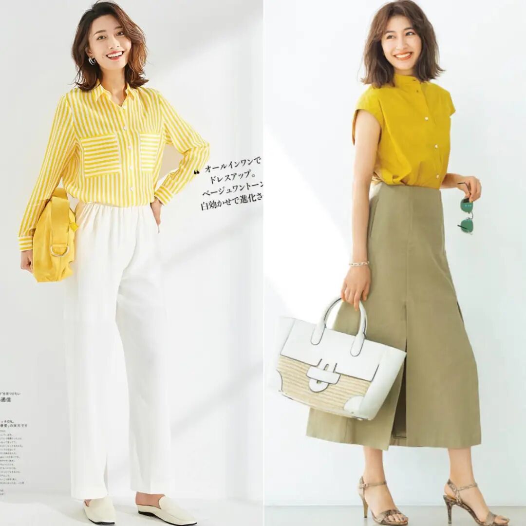 夏天不要穿亮色的衣服,那你什么时候穿?明亮有活力,但不显眼,30岁+大多数轻熟女性会选择这两种配色方案:①浅亮的彩色+无彩色单品,比如浅黄色的衬衫+白色阔腿长裤(左图)②中低饱和的彩色+近似色单品,比如土黄色的衬衫+卡其绿半身裙(右图)在具体的穿着和搭配中,色彩的明度和饱和度可以根据个人的驾驶能力进行调整。这种颜色搭配简单、整洁、充满活力。简单的衬衫可以让人因为明亮的颜色而感到自信和迷人。