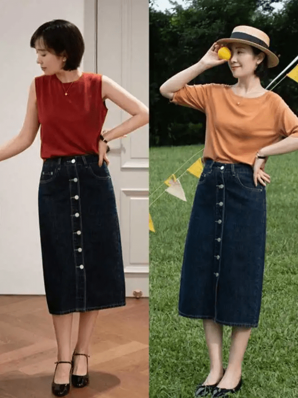 牛仔裙可以表现出非常直观的减龄效果,所以对40岁左右的成熟女性非常友好,但夏季选择牛仔裙最好选择软牛仔面料,一方面软牛仔面料相对凉爽,透气性好,另一方面软牛仔凉爽更强。