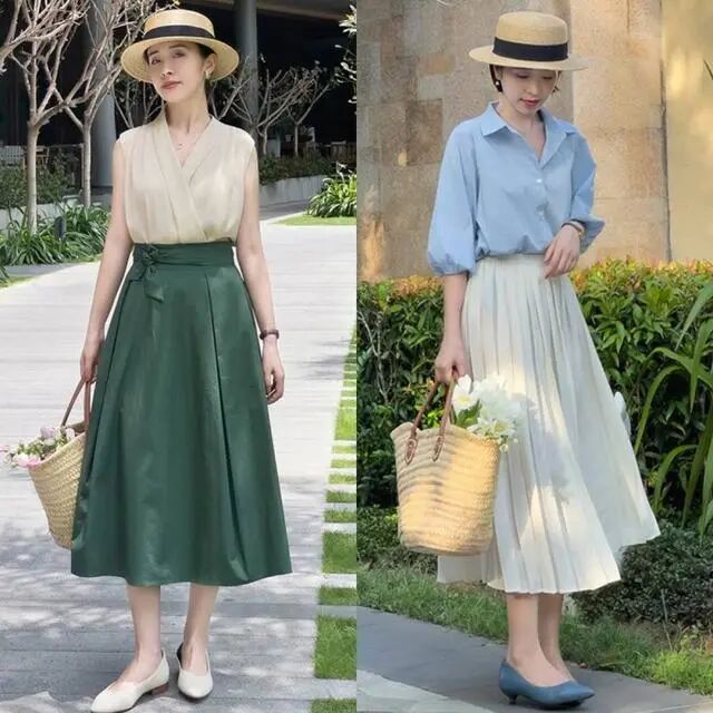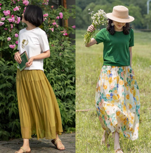 半身裙的面料和款式尤其推荐雪纺半身百褶长裙,雪纺面料轻薄透气,选择长裙更显优雅温柔,夏季穿搭也不会闷热。百褶裙的款式比普通的长裙看起来更加甜美,也是减龄的一个设计细节。