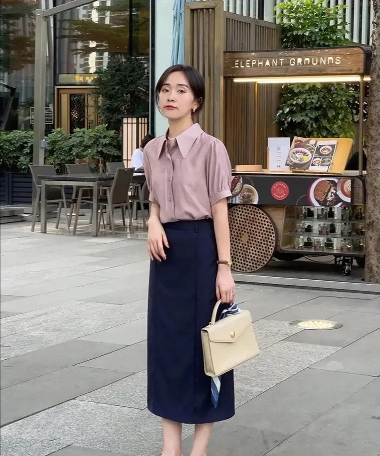 例如这位女士,她采用的是简简单单的深色直筒过膝裙,这种裙子可以用来搭配出风格最多的日常穿搭。想要体现出知性的美感,可以结合颜色不明亮的粉色衬衫。