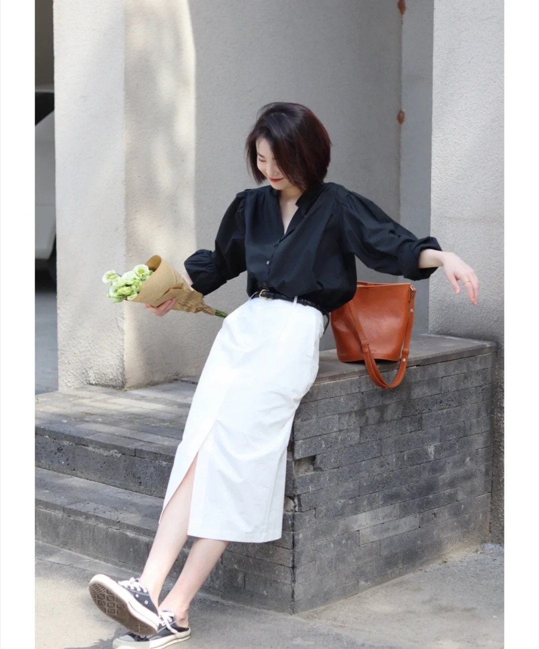 夏天穿直筒裙上衣怎样搭配?黑色衬衫+白色直筒裙 有品位更显气质(4)