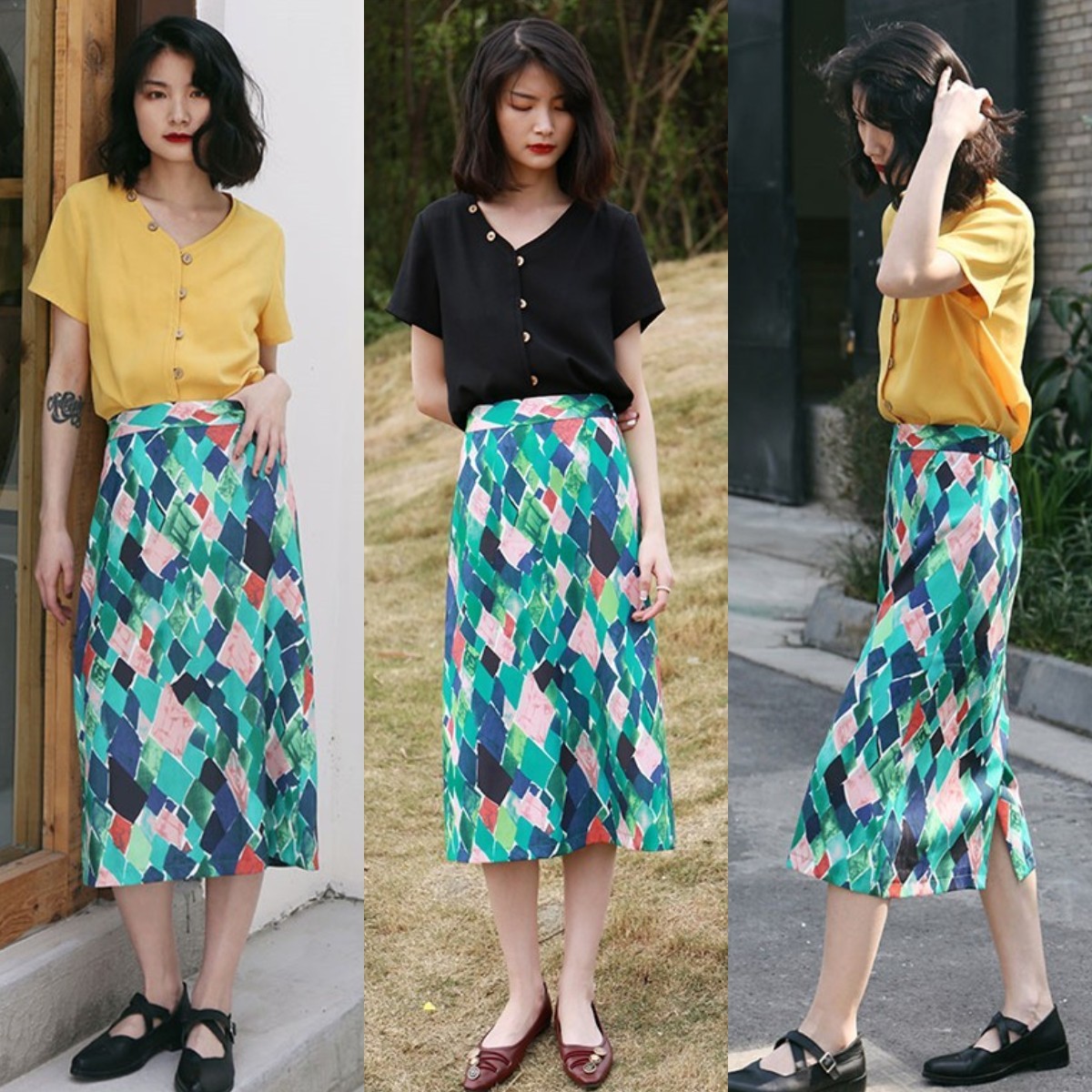 需要注意的是,在穿这种大面积印花、颜色较为艳丽的半身裙时,上装的选择一定要越简单越好,尽量选择简约的纯色款式来进行搭配。这样一来可以让视觉重点更为突出、分清主次,视觉效果也会更加高级和谐。
