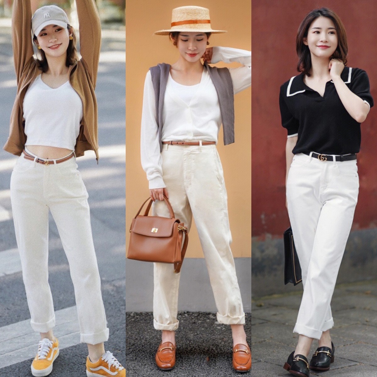 如果你的上身比较瘦的话,那么像这种修身款式的背心、针织衫、T恤都是可以大胆尝试的。修身款式的上衣能够让视线上移,搭配上白色的高腰直筒牛仔裤,美化身材线条的同时还能显得清爽又舒适。如果裤腿款式比较长,还可以将裤腿挽一两道,露出脚踝线条更迷人。