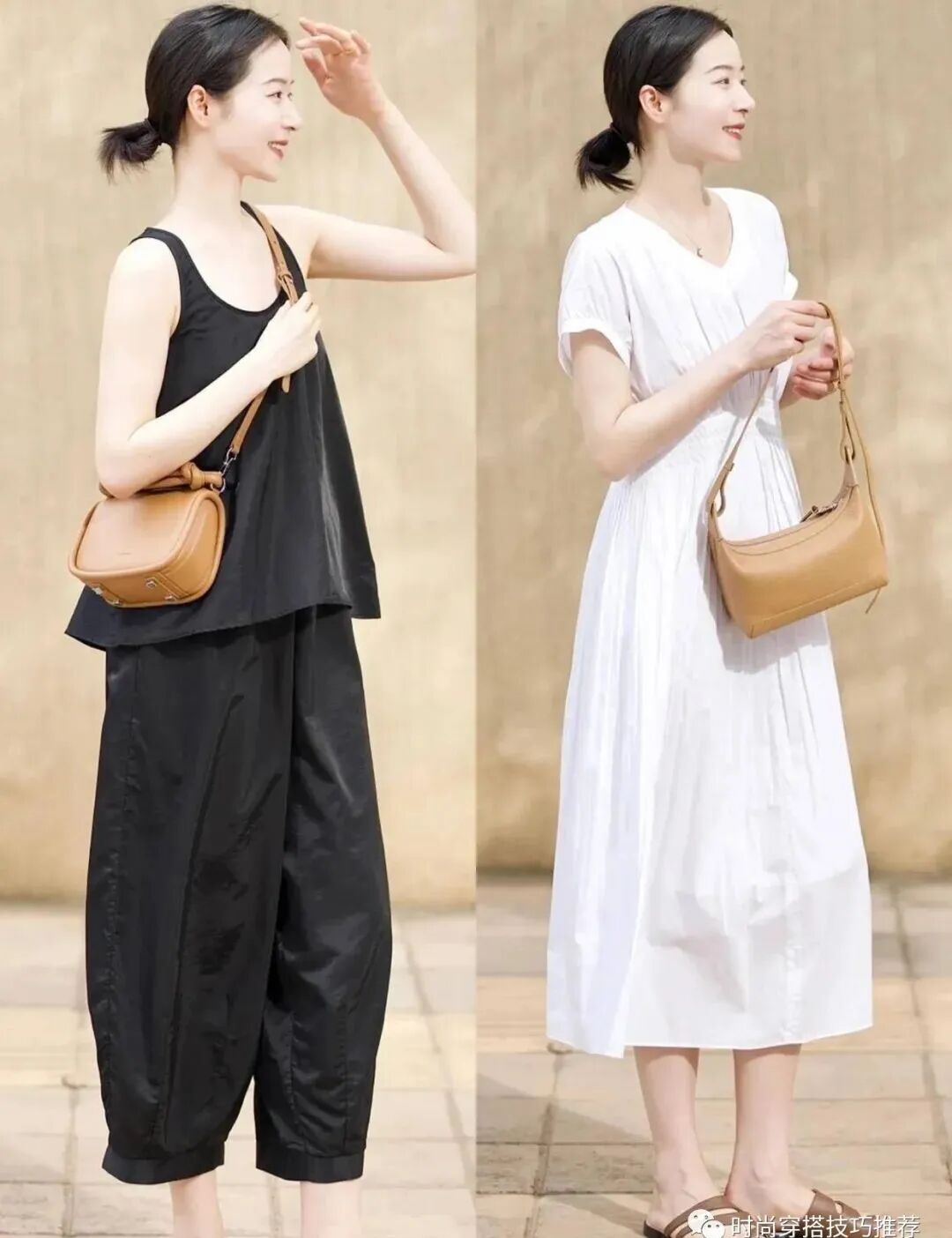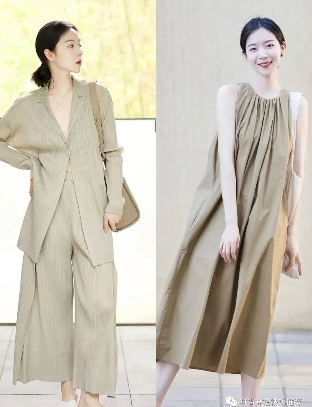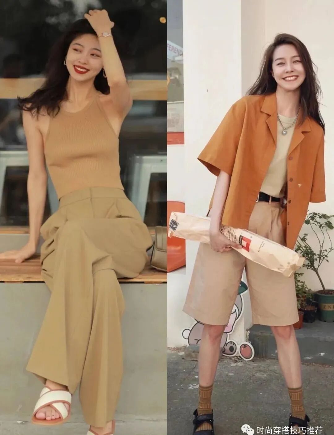 秋天快到了。你也可以试着从这些大地色开始。大地色是一种非常适合秋天的颜色。颜色柔和温柔。穿在身上也能展现穿着者的魅力。看起来浪漫温柔。像这样的卡其色吊带搭配阔腿裤依然很有气质。虽然颜色简单,但整体还是很漂亮的。
